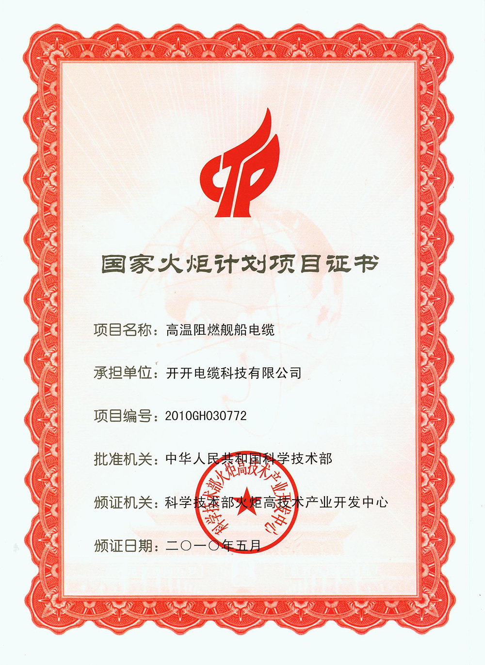目前,中國科學(xué)技術(shù)部火炬高技術(shù)產(chǎn)業(yè)開(kāi)發(fā)中心發(fā)布了2010年國家火炬計劃重點(diǎn)高新技術(shù)企業(yè)評選結果,開(kāi)開(kāi)電纜榮膺獲得此獎。